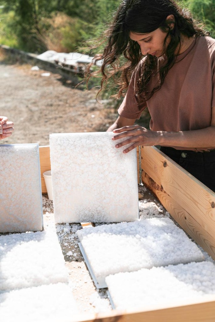 The process to make these panels descends from the historic technique of harvesting salt from seawater. The method uses the warm and dry climate of the South of France to crystallise the dissolved salt.